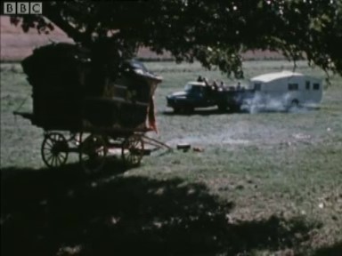 The loss of their horse-drawn ways is the film’s central theme, encapsulated in a mournful scene of one family abandoning their old painted wagon and departing in a truck and towing caravan. Inside another caravan, a family watch a television documentary in which council officials and members of the public spout disgust about them and their lifestyle. The commentary on the programme they are watching states that unlike the old romantic image of the gypsy as “the migrant worker who appeared at harvest-time to pick hops and cherries, or who was often to be seen at the roadside selling clothes pegs”, the gypsy has had to adapt to “more lucrative trades such as car-breaking and scrap-dealing”, being viewed by many as “at best work-shy tax-dodgers and at worse as wholly untrustworthy—in fact, as an alien population”.